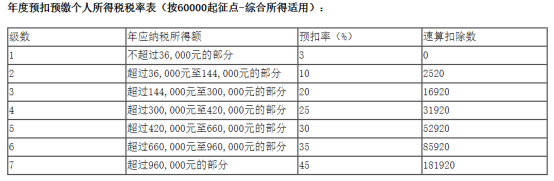 適用工資、薪金的個人所得稅采用七級超額累進稅率,也就是根據個人的薪資劃分為七個等級,不同等級的稅率不同,最低一級為3%,最高一級為45%,具體如下:
