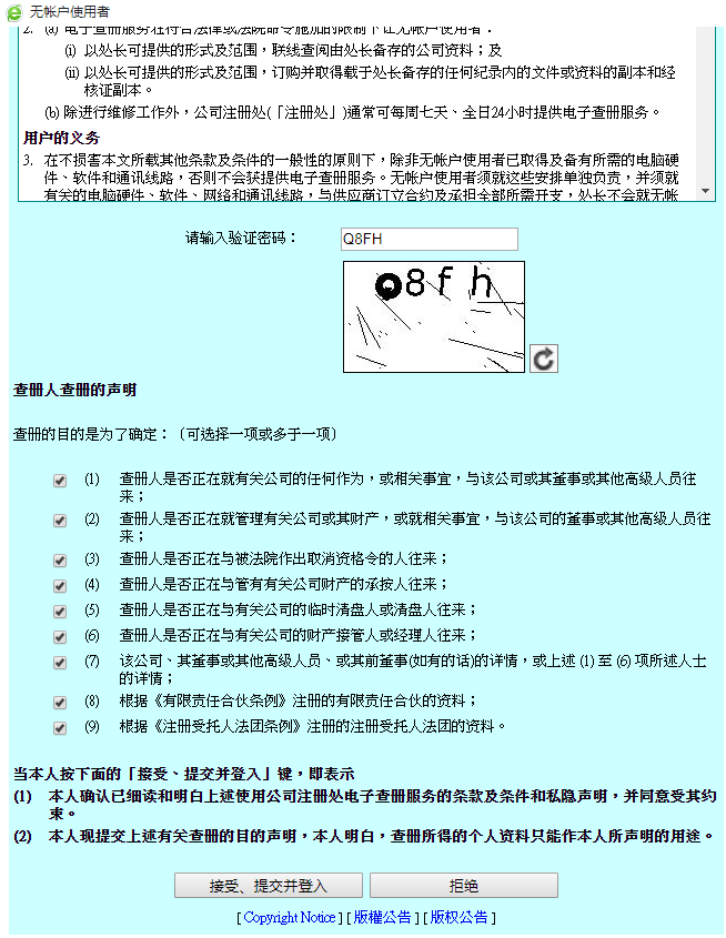 3、輸入驗證碼,注意大小寫必須一直,否則驗證碼會出現(xiàn)錯誤導(dǎo)致無法進(jìn)入平臺。將查冊目的選項全部勾選,可不用再返回界面勾選,點擊“接受、提交并登入”進(jìn)入。