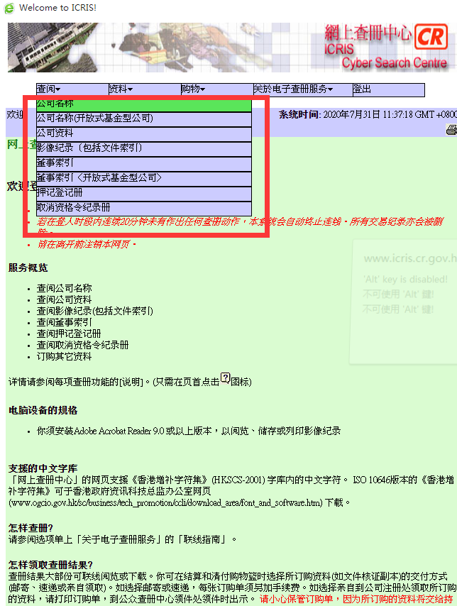1、打開網(wǎng)上查冊中心網(wǎng)址:www.icris.cr.gov.hk ,不要百度搜索注冊處,香港的網(wǎng)站和大陸網(wǎng)站是有很多不同的,滑動至最下方,點擊紫色字體。