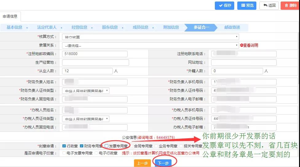 第十七步:填寫多證合一信息,適用會計制度填寫,一般民營的都是選擇“小企業(yè)會計準則”