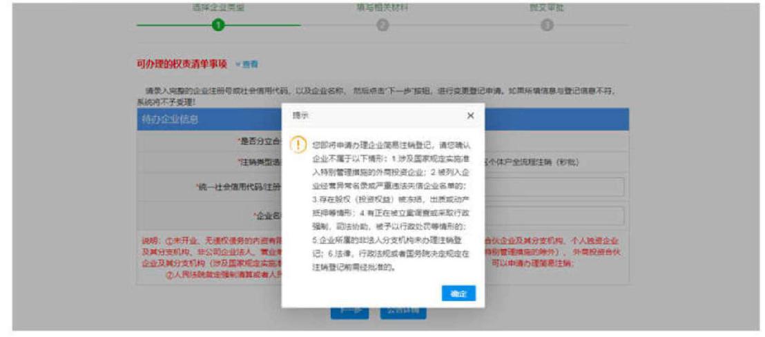 4、勾選選擇簡易注銷,輸入企業(yè)相關(guān)信息,點擊下一步進(jìn)入簡易注銷公告填報功能。
